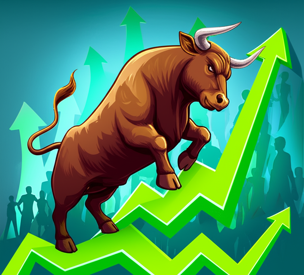 ภาพประกอบกระทิงพุ่งทะยานขึ้นผ่านกราฟตลาดหุ้นที่เต็มไปด้วยลูกศรชี้ขึ้นและนักลงทุนที่มั่นใจ