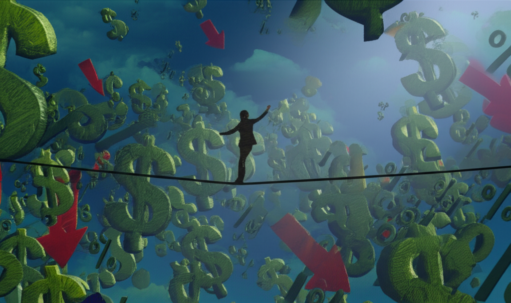ภาพประกอบบุคคลกำลังทรงตัวบนเชือกตึงท่ามกลางสัญลักษณ์ตลาดที่ผันผวน