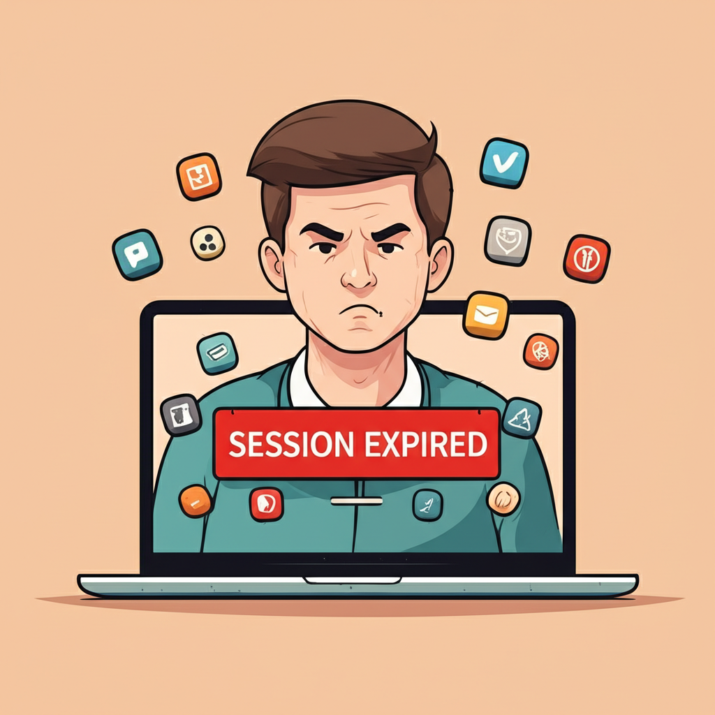 ภาพประกอบผู้ใช้งานหงุดหงิดกับข้อความเซสชั่นหมดอายุบนแล็ปท็อป รายล้อมด้วยไอคอนแอปพลิเคชัน